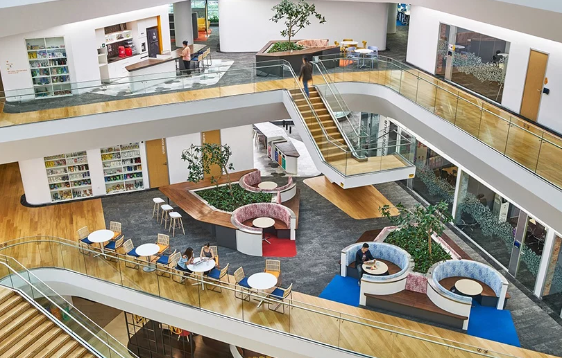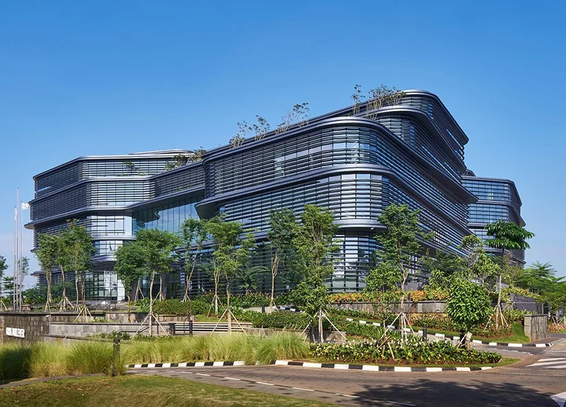 Aedas的整體計劃暗示了印度尼西亞村莊的傳統(tǒng)設(shè)計,辦公室裝修其中包含模仿“廣場”功能和連接“街道”的區(qū)域。一樓辦公室裝修致力于滿足公眾的需求,包括宗教中心,健身中心,用餐區(qū)和多功能空間。這些室內(nèi)空間自由流入外部綠色口袋和園景甲板 - 由立面上鋁制葉片百葉窗的起伏形成的形式。該辦公室裝修系統(tǒng)與建筑物的幕墻一起,有助于提供遮陽和保持舒適的室內(nèi)溫度,同時最大化進入空間的自然光量。