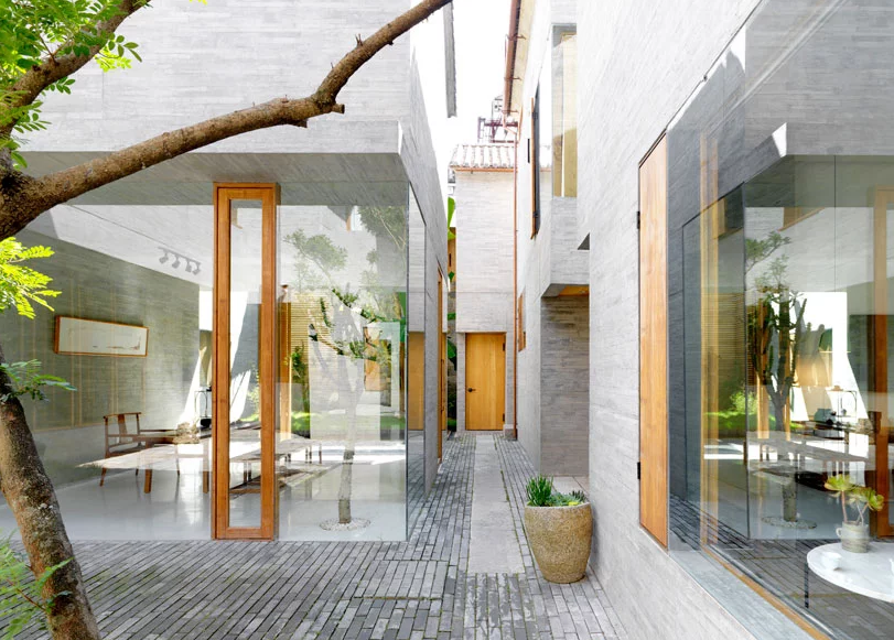 庭院經(jīng)常有一天中某些時間太暗的缺陷; 然而,sunyata酒店沒有這個問題。朝陽建筑師設(shè)計了一個允許光線和視覺透明度的方案,使庭院成為一個開放的空間,光線投射到各個角落,陰影和陽光混合在一個舒緩的陰陽之中。玻璃飛機(jī)是如此專業(yè)地安裝,即使是人類也會懷疑它們的存在/知道空間的起點和終點。